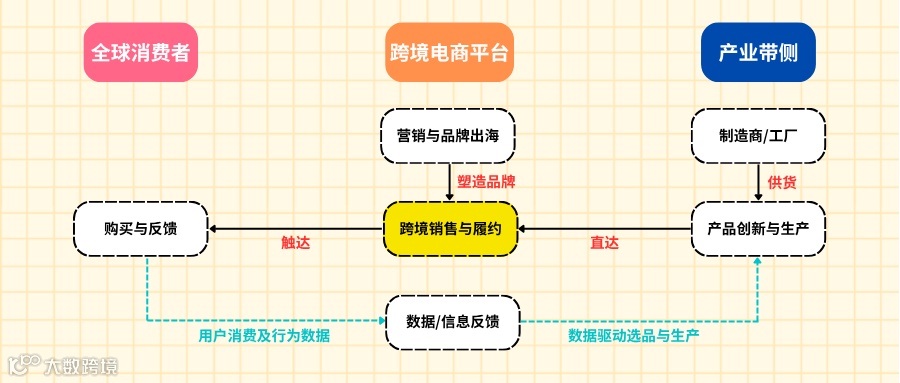 包括销售渠道(跨境电商平台/独立站),及跨境电商赋能服务体系,如数据分析、数字营销、跨境物流、支付结算、人才培训等,为“前店后厂”模式提供支撑。