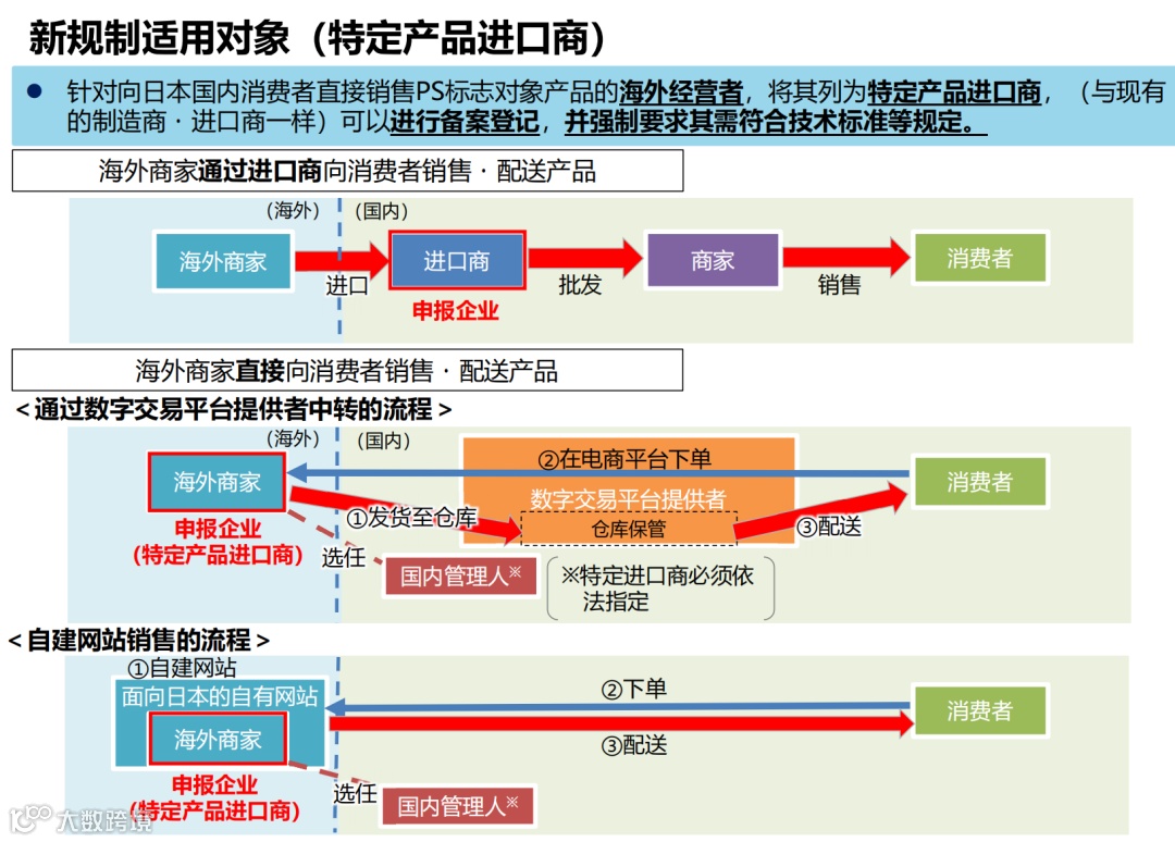 针对通过电商平台(如亚马逊日本、temu、速卖通、国际站等)或自建网站,直接向日本消费者销售PSE/PS标志对象产品的海外经营者,将其列为特定产品进口商(与现有的制造商/进口商一样),需进行备案登记,并强制要求其需符合技术标准等规定。