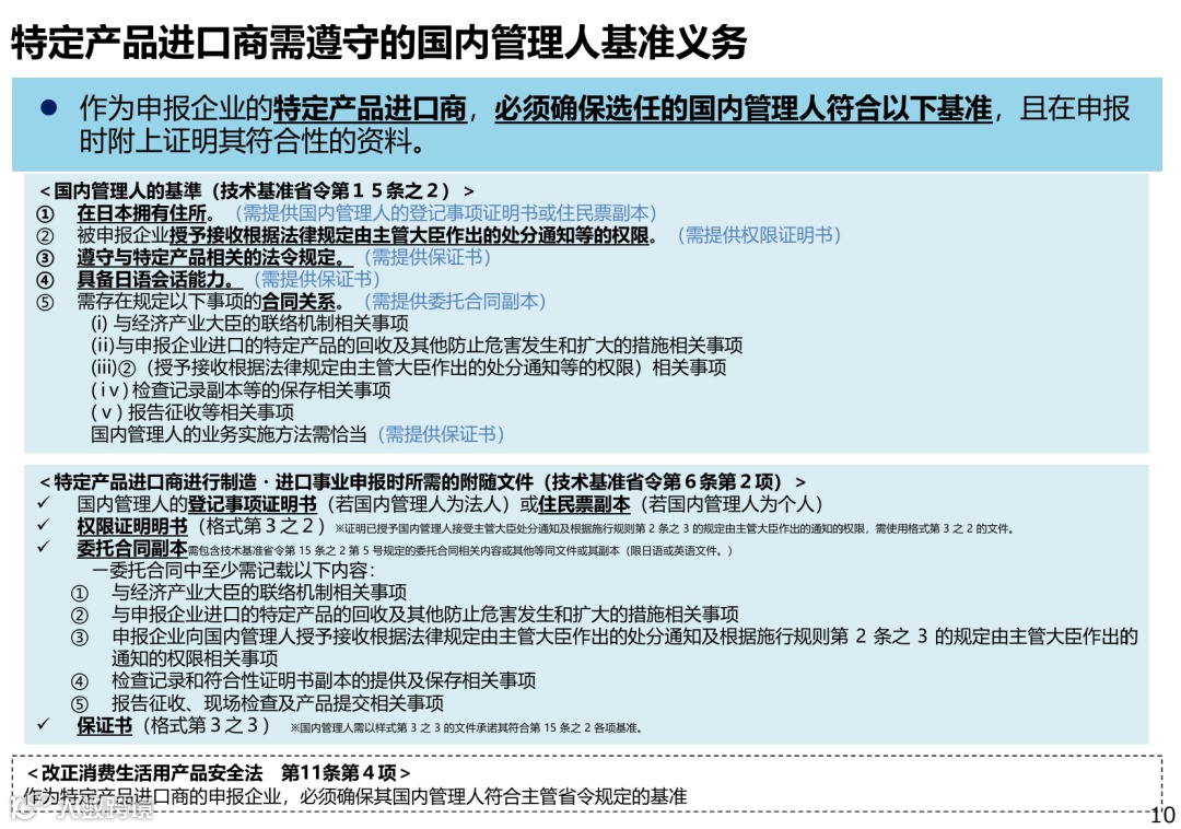 准备好申报表、国内管理人的登记事项证明书、授权书、委托合同等资料,在产品进口或上架前完成经济产业省(METI)备案,成为"特定进口事业者"。