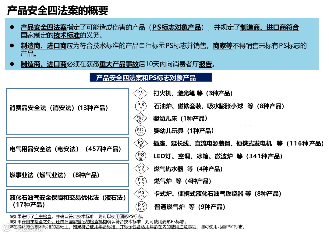 涵盖部分生活用品、婴幼儿用品、打火机、取暖设备等(13类需PS标志)。必须符合国家技术基准,贴PS(或PSC)标志并备案。卖家需购买人身伤害赔偿保险(保额上限:每位受害人1000万日元、年度3000万日元),并需履行事故报告(10日内)与召回配合义务。
