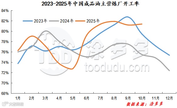2025年国内成品油主营炼厂开工率呈现“M”线型走势,平均开工率78.45%,同比去年同期76.89%上涨2.03s%。其中8月开工率处于全年高位,5月开工率最低。