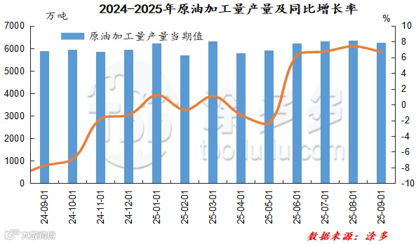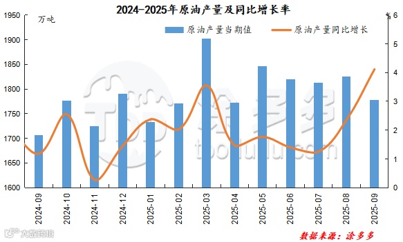 原油产量方面,2025年1-9月累计生产原油16260.9万吨,同比15984.7万吨增加276.2万吨,幅度4.12%;原油加工量方面,2025年1-9月累计加工原油55083.3万吨,同比53701.2万吨增加1382.1万吨,幅度6.74%。
