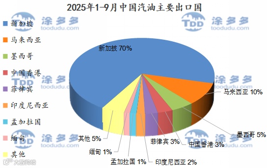 据统计,2025年1-9月国内汽油出口至新加坡仍占较大比重。具体来看主要出口国前三:出口新加坡汽油499.30万吨,占主要出口国70%;出口马来西亚60.41万吨,占比10%;出口墨西哥30.81万吨,占比4%。