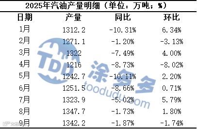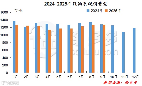 2025年1-9月汽油表观消费总量11023.7万吨,较去年同期11707.92万吨增加684.22万吨,幅度-5.84%。