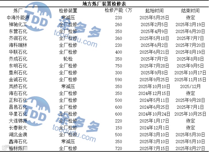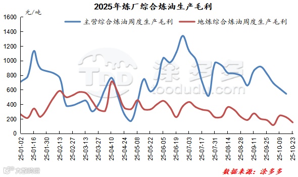 2025年炼厂综合炼油生产毛利整体呈现震荡波动趋势。主营炼油毛利5月初毛利最低,在173.42元/吨,后续震荡,到6月底达13440.45元/吨,7月开始主营炼油毛利开始下滑;1-10月份地炼炼油毛利波动幅度在118-717元/吨左右,1-10月最高位为4月上旬716.89元/吨。