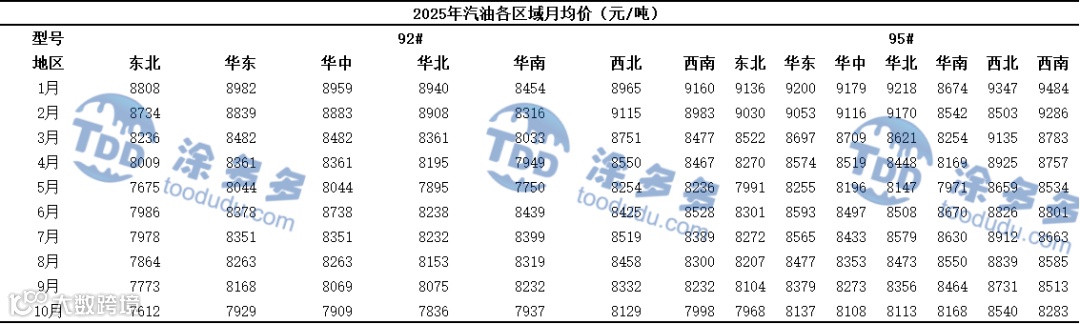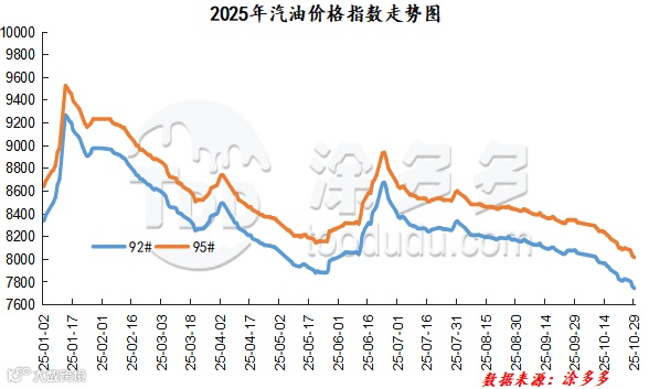 截至10月底汽油市场价格整体呈现震荡下跌走势。1、原油成本方面,本月国际油价在多空因素交织下呈现复杂态势。地缘政治风险与长期供需基本面持续博弈,虽受俄乌局势及对俄制裁等因素推动出现反弹,但由于全球经济增长放缓抑制需求,且OPEC+维持增产,市场供过于求格局未变,对汽油价格支撑有限。2、供应端,全月国内汽油市场供应持续宽松过剩。受节前备货导致库存高位影响,市场基础资源充裕,节后地方炼厂排库意愿较强,进一步加剧供应压力。主营单位及地方炼厂因出货不畅,普遍让利促销,挺价意愿缺失,市场价格支撑持续减弱。3、需求方面来看,本月汽油消费呈现趋势性下滑。假期出行高峰结束后,汽油需求显著回落,叠加新能源车辆替代效应,市场成交氛围清淡。中下游业者普遍持谨慎心态,坚持按需采购策略,市场看跌情绪逐步加深,进一步压制价格表现。4、从成品油调价机制来看,截至发稿日10月汽油有两次调价日,均为下调兑现,共计下调340元/吨。