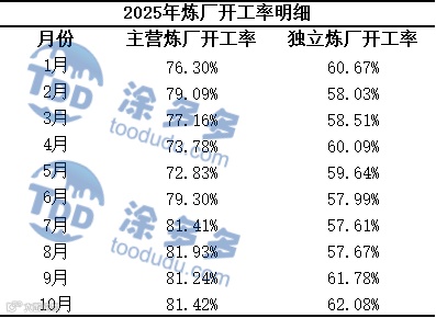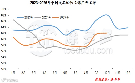2025年国内成品油独立炼厂平均开工率59.41%,同比去年同期59.62%降低0.21%。其中10月开工率处于全年高位,7月开工率最低。