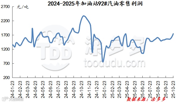 2025年加油站92#汽油零售利润变化呈震荡上调走势,一季度零售利润震荡上行,二季度4月有大涨中旬,下旬至5月迅速回调,后震荡上行。三季度先震荡,季度末有上行,9月份整体处于相对高位。10月零售利润空间扩大,涨至年内高位逾1749元/吨。