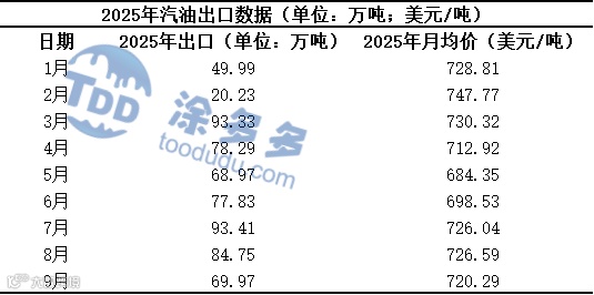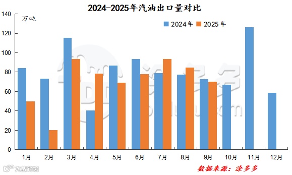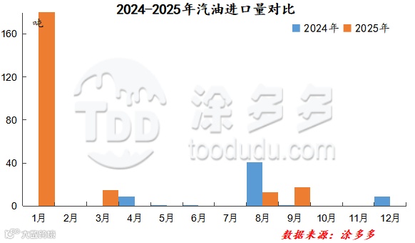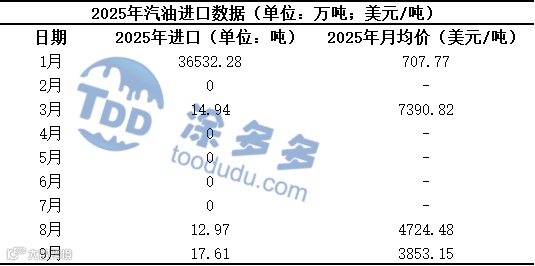 据海关数据显示,2025年1-9月累计进口汽油36577.8吨,主要进口量为1月36532.28吨,多个月份无进口量。