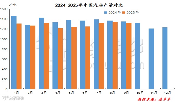 2025年1-9月我国汽油产量在11611.3万吨,较去年同期12378.3万吨减少767万吨,幅度-6.20%。