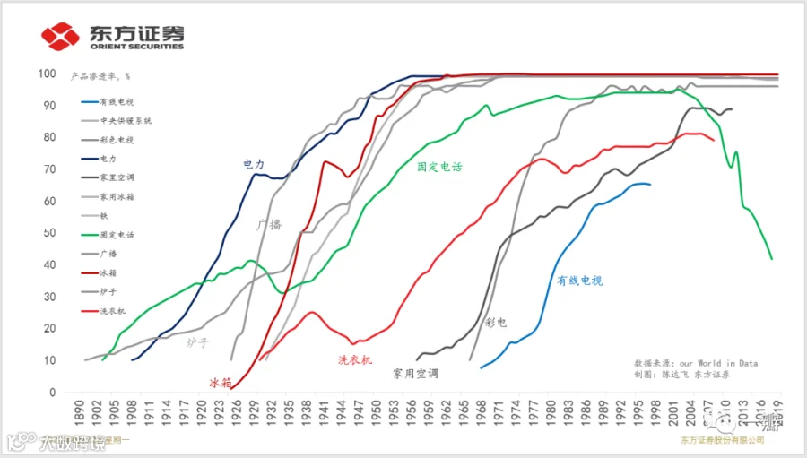究其原因,一方面,是美国家用电气市场的饱和。截止到20世纪70年代末,主要家用电器的市场渗透率均已经超过50%以上。电力在20世纪50年代就已全面覆盖美国家庭,电炉和冰箱在20世纪50年代中叶趋于饱和。进入70年代后,空调的扩散速度明显下降。彩电的扩散在80年代开始放缓……另一方面,通用电气还受到了来自日本和韩国的激烈竞争。离岸,也是为了生存。
