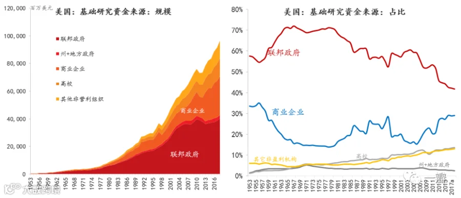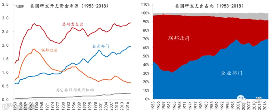军事工业联合体是军方、产业和科研三者的联合,军方向产业提供采购订单和军事津贴,向科研提供研发资金,故在联合体中处于相对核心的地位。自二战爆发之后,美国联邦政府在研发投入上便开始占主导地位。