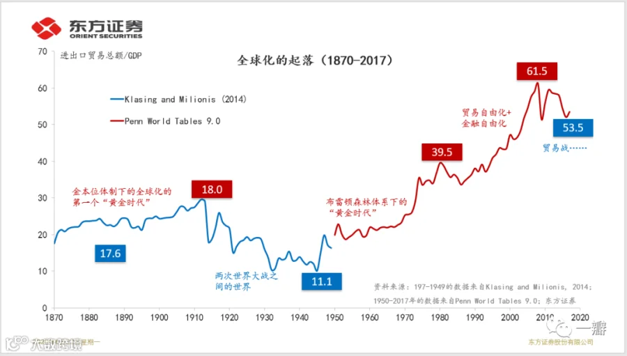 资料来源:197-1949的数据来自Klasing and Milionis, 2014;1950-2017年的数据来自Penn World Tables 9.0;东方证券