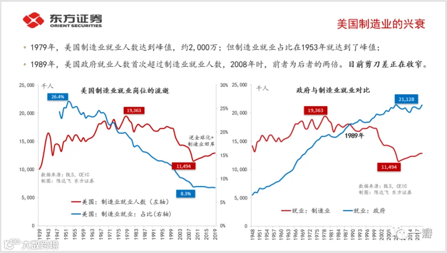 由单个企业,到单个产业,再到整个制造业;由单个企业的员工,到一个家庭,再到一个城镇、州乃至整个国家。制造业对美国的意义可能不局限于11%的GDP份额和1,200万就业岗位,而是美国的兴衰。用GDP份额或其创造的就业去理解制造业的重要性,是一个错的离谱的“常识”。