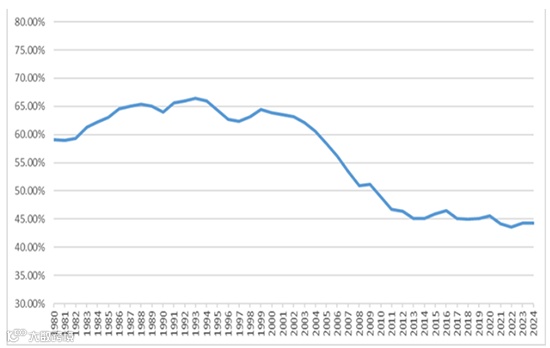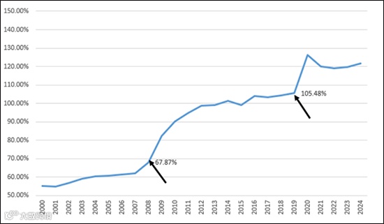 2008年全球爆发金融危机,全球同步采取财政货币扩张政策救市,全球经济逐步恢复后,主要国家债务负担率却没有下降。自2008年起,美国债务负担率从50%跃升至100%的水平后始终未能回落。除了2008年的全球金融危机以外,2008年另一个关键转折点是欧美人口结构的变化。数据显示,2000年以后欧洲抚养比出现结构性转折,至2008年前后老年抚养比例持续攀升,财政压力显著加大,美国的情况也与之相似。从2008年至今,欧美国家普遍面临老龄化加剧、产业空心化的情况,叠加新冠疫情的冲击,一步步强化了上述趋势。2020年全球疫情期间美国采取紧急刺激措施,通过直接发放现金以维持消费,使债务负担率经历了第二轮攀升,终于达到120%的高位,当年美国债务率正式突破二战时期峰值,成为影响全球政治、金融与资本市场的重要转折点,其后续影响仍在持续显现。此外,一个值得关注的历史数据是,克林顿在任期最后一年曾实现两千多亿美元的财政盈余。而1999-2001年也是金价自1980年以后价格最低的时间段。