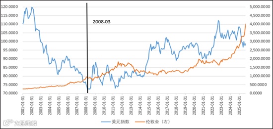 我们将时间尺度拉长,从2008年开始观察。黄金与美元之间长期存在反向关系,但2008年成为全球黄金定价机制的一个重要转折点。那一年3月,美元指数处于约70的历史低位,至今已上涨约40%至98;同期,黄金价格则从每盎司约1000美元上涨至目前的4300美元之上。