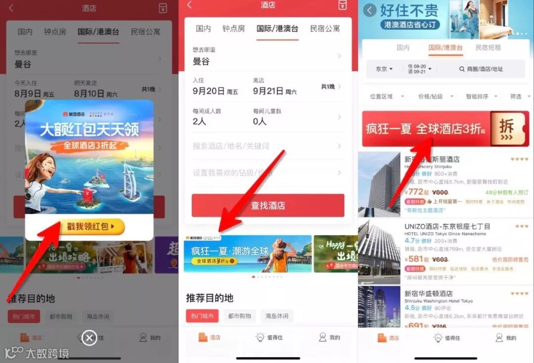 首先,境外酒店会场点击“瓜分千万酒店红包”可领单体酒店红包。