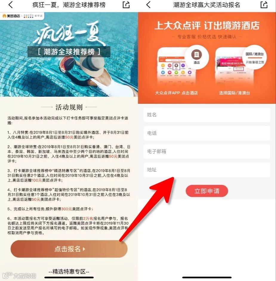 ③ 打卡潮游全球推荐榜中“精选特惠专区”的酒店,在2019年8月1日至8月31日购买任意2个酒店,入住时间在2019年10月31日之前,入住在4晚及以上,离店后返赠100元美团点评卡;