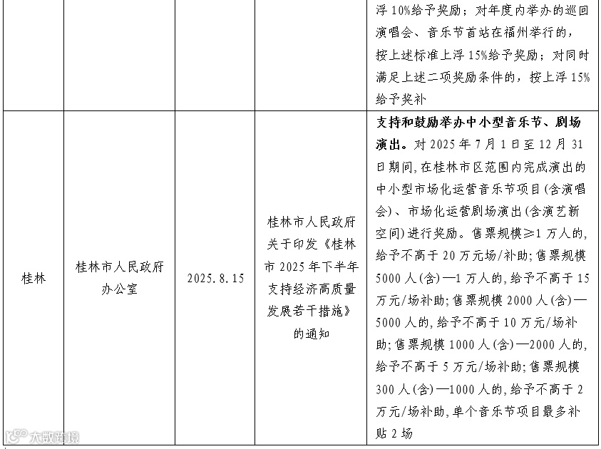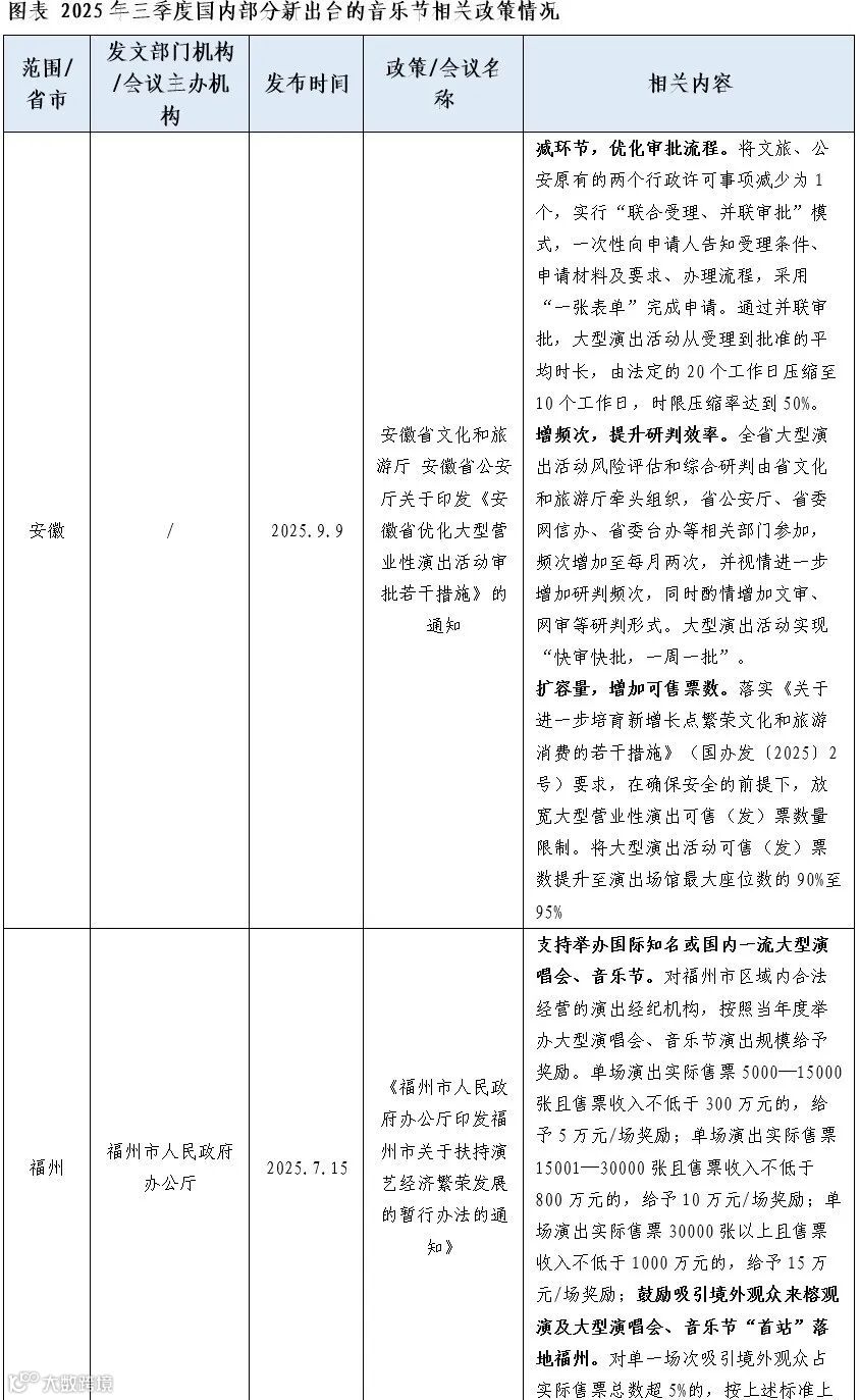2025年三季度,针对音乐节发展,各地均出台了扶持政策。安徽推出大型营业性演出审批优化举措,以“联合审批”模式压缩时限、增加研判频次、扩大可售票数,助力音乐节等演出活动高效开展;福州、桂林则支持、鼓励举办音乐节并给予资金奖励,福州按售票规模分级奖励且设境外观众等上浮奖励,桂林对中小型音乐节依据售票规模提供资金补助。
