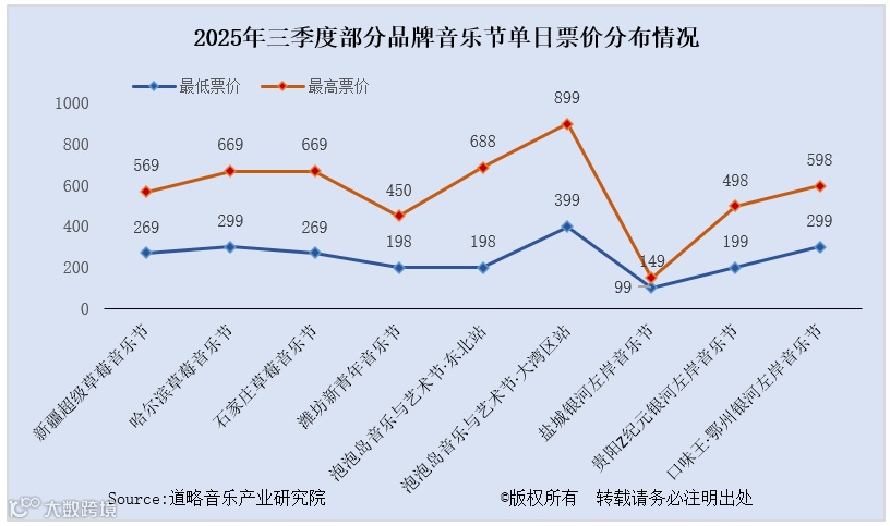 2025年三季度,中国音乐节整体票价虽呈现向中低价位调整的明显趋势,但部分品牌音乐节票价仍有所提升。如石家庄草莓音乐节单日最高票价达669元,较2024年提高约10元;潍坊新青年音乐节单日最高票价升至450元,较去年同期上升约30元。