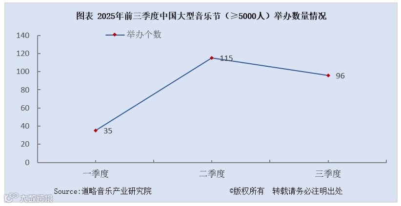 2025年三季度,全国大型音乐节(≥5000人)的举办数量达96个,与二季度的115个相比,环比下降16.5%,呈现一定回落,但在暑期消费旺季的持续带动下,虽较二季度的峰值有所回调,但仍远高于一季度,整体在2025年前三季度中处于较高水平。