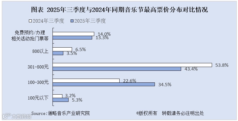 票价:音乐节票价持续向中低价位倾斜,最低票价为100-300元之间的音乐节占比超五成,最高票价在301-800元之间的音乐节大幅下降。 -