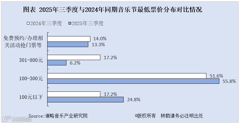 2025年三季度,音乐节最低票价在100-300元票价区间占比较2024年同期提升至55.8%,100元以下占比增至24.8%。相比之下,最低票价在301-800元占比从2024年的17.2%降至6.2%。总体而言,2025年三季度中国音乐节最低票价在100-300元区间的占比较2024年同期进一步扩大,100元以下区间占比提升,301-800元区间占比大幅下降,整体票价结构向中低价位集中的趋势更明显。
