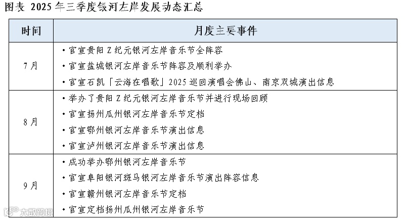 2025年三季度,银河左岸精彩不断,不仅圆满落地贵阳、盐城、鄂州等多城音乐节,还接连官宣扬州瓜州、赣州、阜阳等地音乐节定档;同时,旗下演唱会业务也在稳步推进。