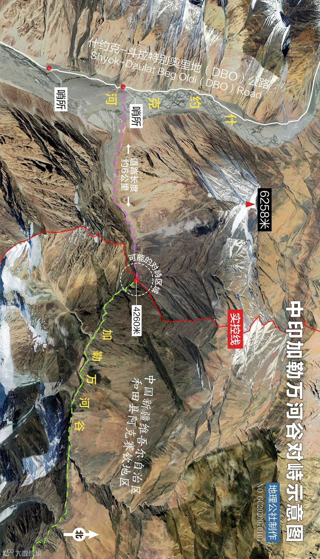班公湖以北的中印实控线与什约克河伴行,全长约200公里。控制了加勒万河口,就相当于控制了什约克河战略通道。