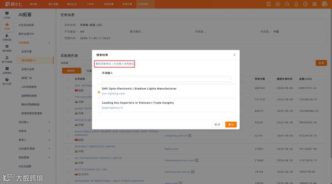 企业详情中的海关数据模块增加修改搜索企业名称选项,可通过调整公司名称查询到准确的贸易数据记录。
