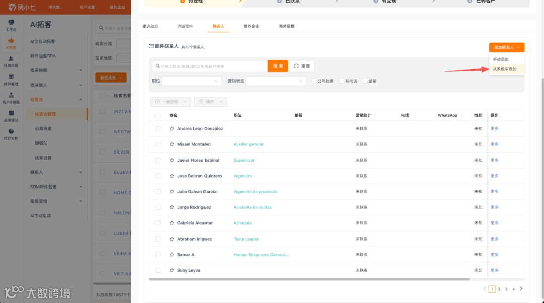 6、建为线索不再强制填写域名,支持更多场景下建为线索,如EDM邮件营销结果、AI询盘、自动化拓客、邮件运营RPA等模块。只需勾选需要建为线索的联系人即可快速创建线索,不会再次同步所有无关联系人,仅保留勾选且需要跟进的联系人;
