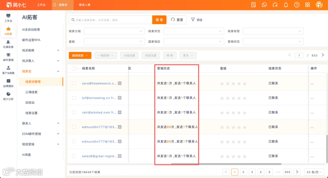 8、线索列表新增营销历史展示,可查看到累计发送次数与发送联系人数量;