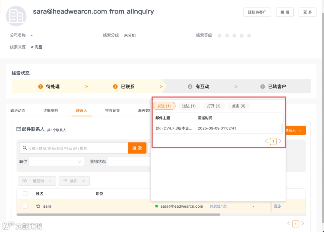 9、线索详情联系人增加邮箱状态展示,新增营销统计数据查看;
