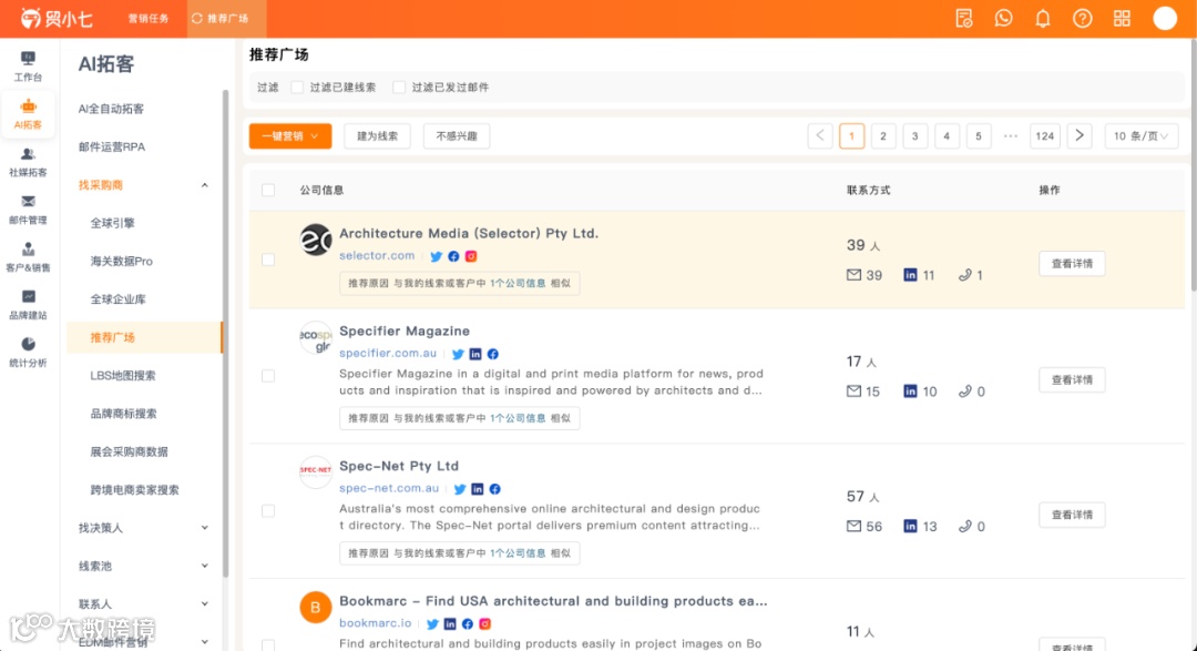 5、更直观、更多信息的线索资料页,建为线索后系统将自动补全企业基础信息(公司名称、国家地区、详细地址等信息);