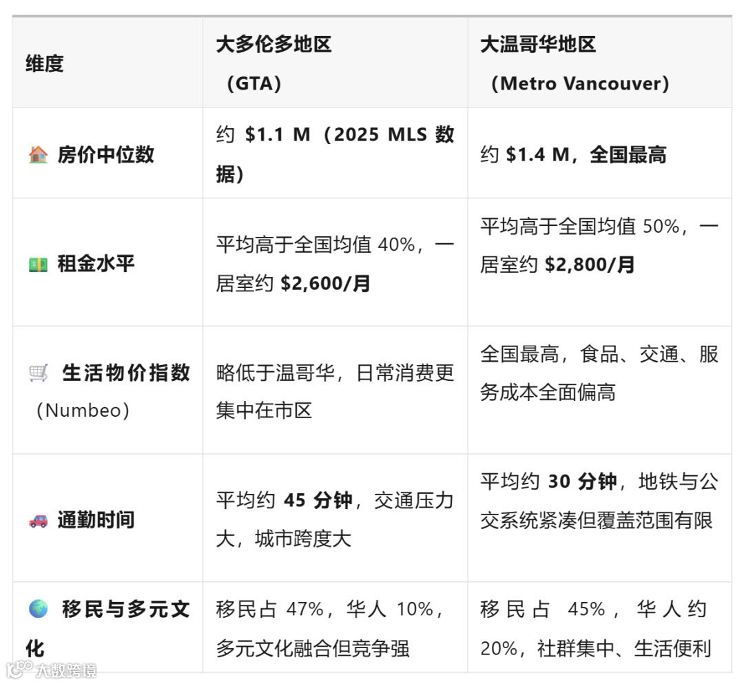 受历史、地理、气候等影响,多伦多是经济和教育重镇,温哥华更为轻松舒适自然。