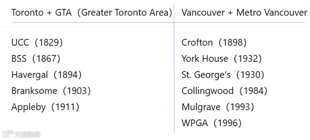 安省的教育体系有 150年以上积淀,很多顶级私校如 BSS(1867)、Havergal(1894)、UCC(1829)都诞生于维多利亚女王时代: