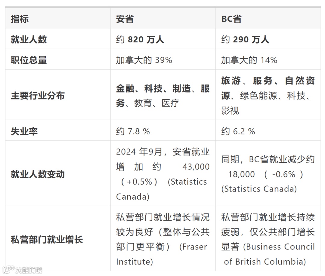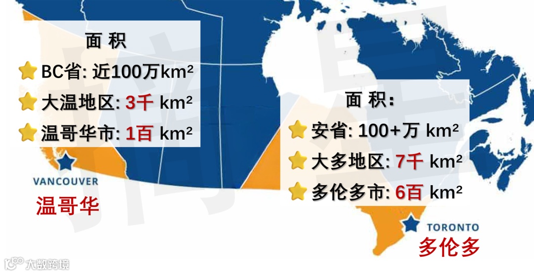 安省(107 万 km²)与 BC 省(94 万 km²)在地理面积上差不多大,但安省的城市群(特别是大多地区)比 BC 省的大温地区要庞大得多。