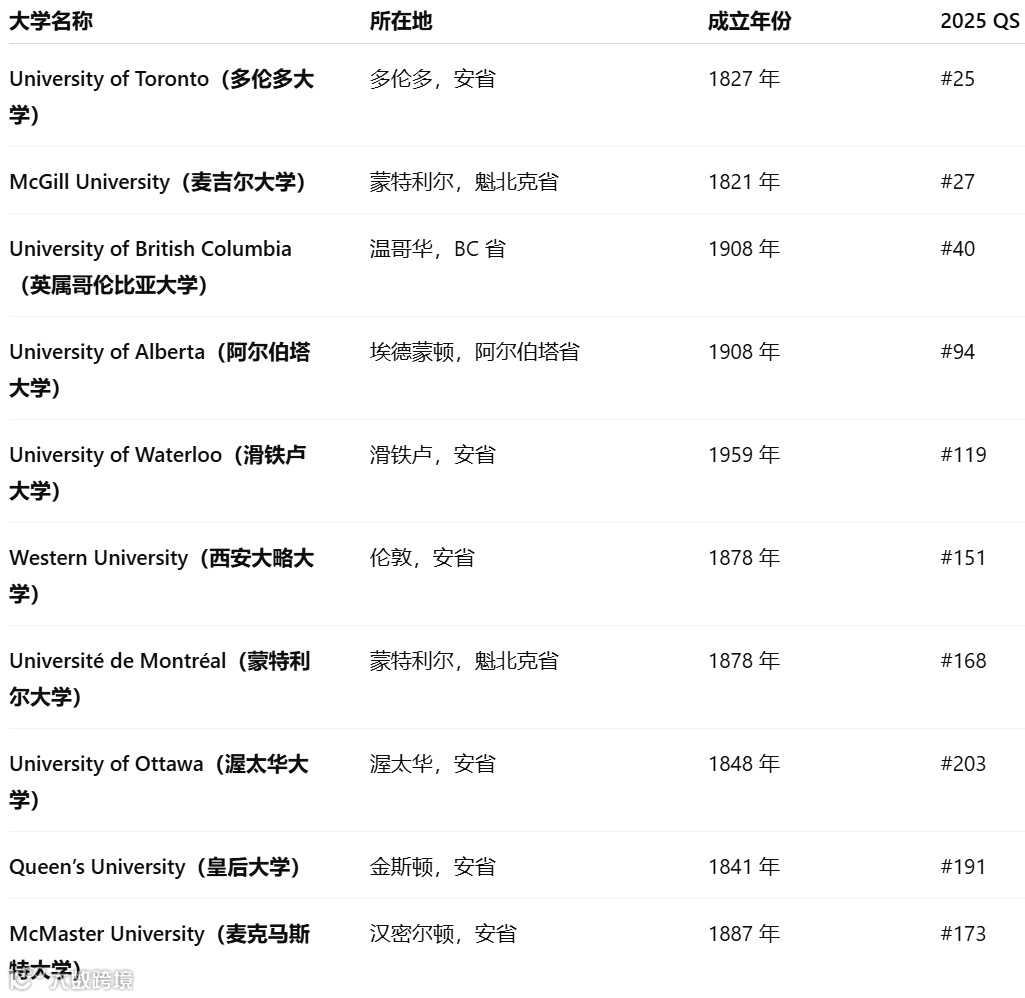 下面是按2025年QS世界大学的排名,给15所加拿大U15大学进行排序。(QS排名来自英国,严重偏向英国大学,所以排名仅做参考)。
