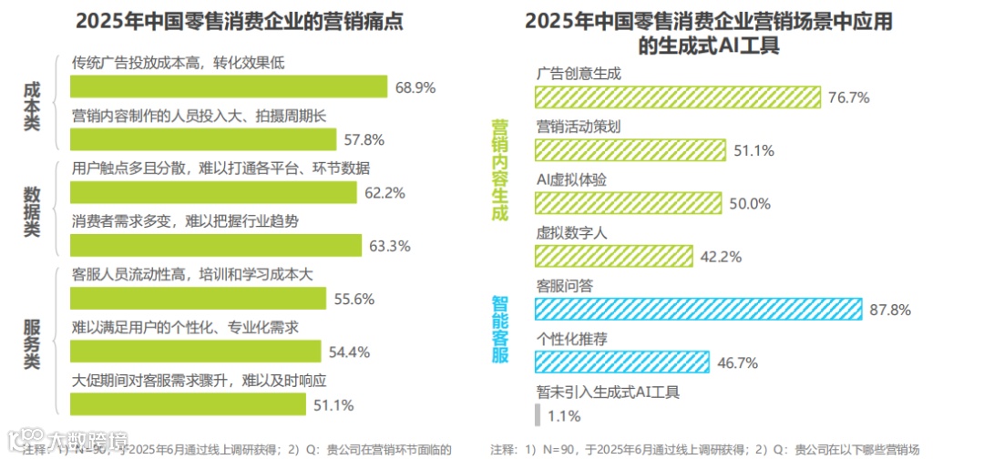 营销成本高企、用户触点分散、需求碎片化,是零售消费企业面临的共同痛点。68.9% 的企业认为传统广告投放成本高、转化效果低,62.2% 的企业面临用户数据难以打通的难题,57.8% 的企业反映营销内容制作投入大、周期长。而生成式 AI 的应用,正在重构营销内容生产与服务响应链条,成为破解这些痛点的关键。