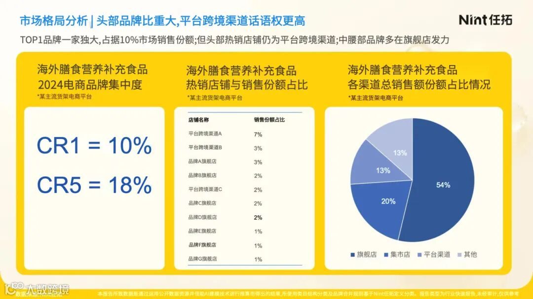 进一步分析海外膳食营养补充食品领域,品牌效应显著。头部品牌占据了10%的市场销售份额,领先优势明显。从销售渠道来看,头部热销店铺多集中于平台跨境渠道,中腰部品牌则主要依托旗舰店开展销售。消费者对海外膳食营养品的专项修护功能评价较高,如特定维生素、矿物质补充以及对关节、心血管的保健功效,产品精准定位契合了消费者日益细化的健康需求。