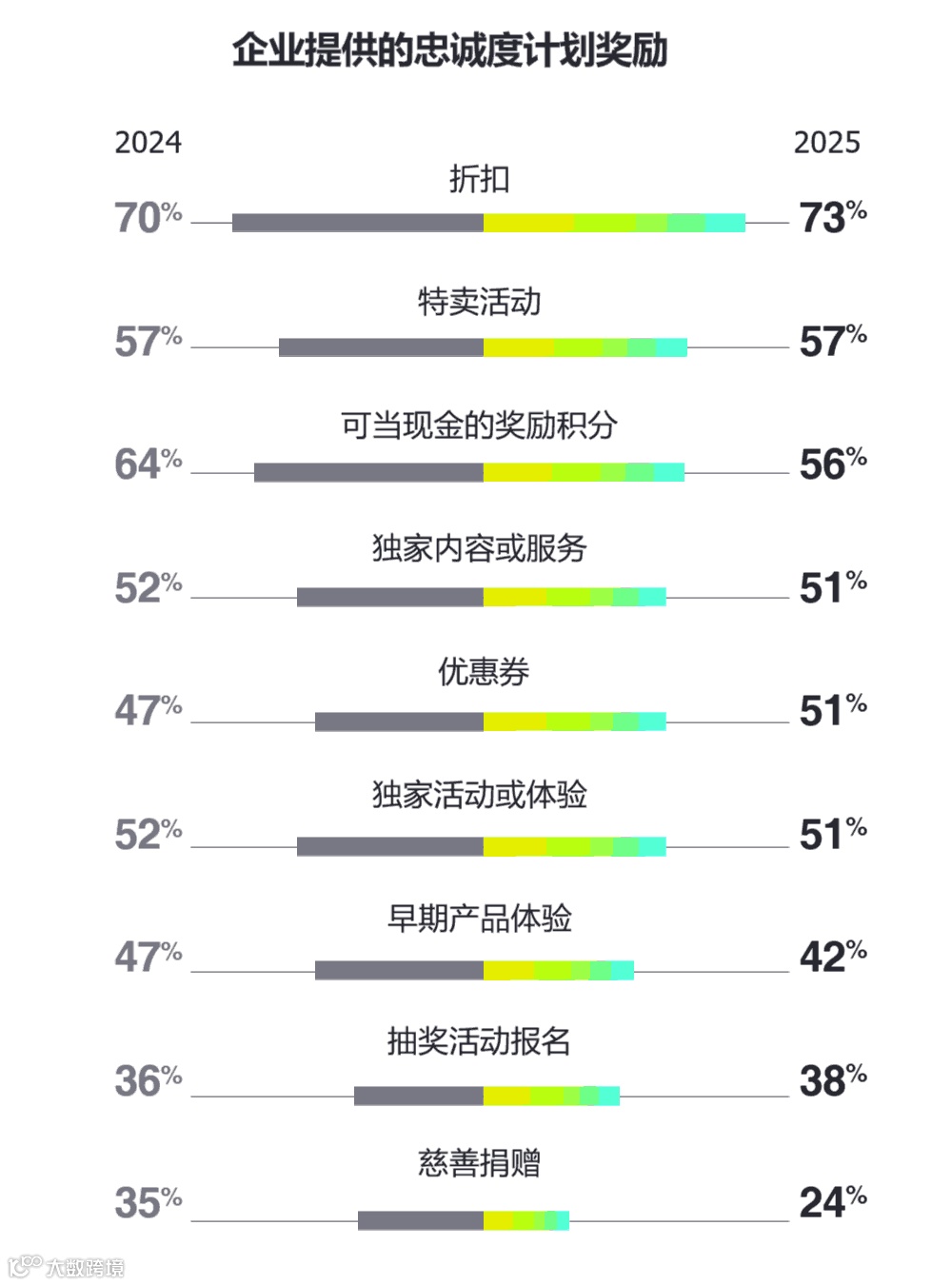 这些结果引发了一个值得品牌深思的问题:在“打造适用所有客户的忠诚度方案”与“精准个性化突出目标客户价值”之间,如何取得平衡?该策略的有效实施关键在于对客户洞察与个性化服务的投入——这一观点也得到了来自多个行业的企业调查受访者的认同。