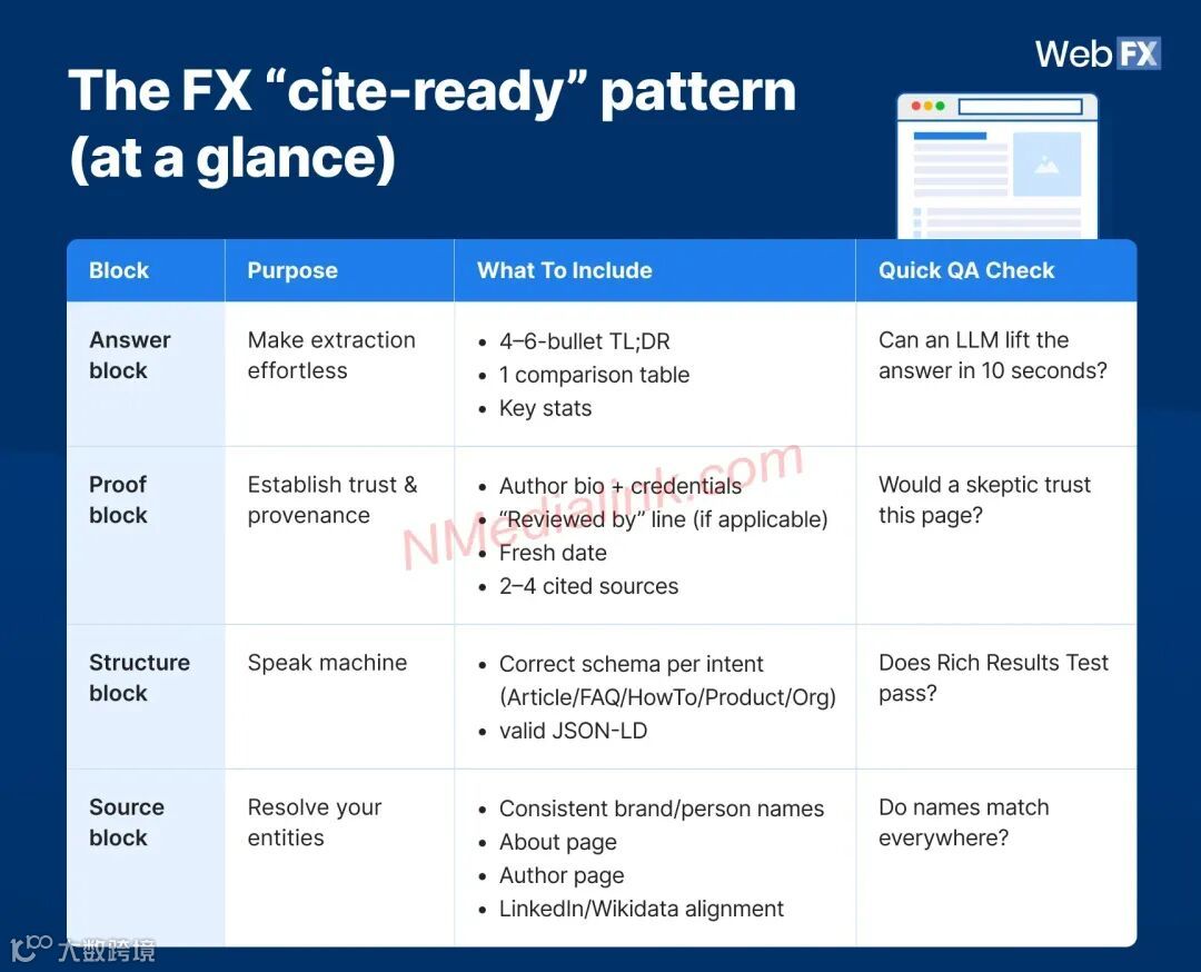 在顶部放置一个4-6个要点的精简摘要,包含AI可即时提取的关键统计数据。 - 证明区块: