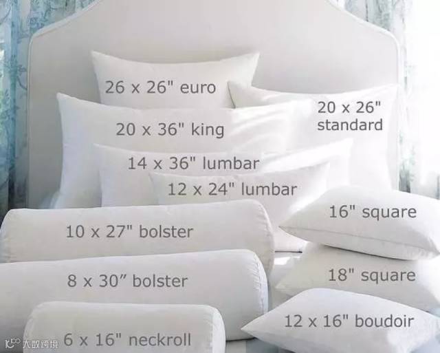 除了图上列的尺寸,比较常见的还有Queen(20 x 30")和Body Pillow(20 x 54")。一般正常睡觉用的睡枕是Standard, Queen和King,根据床的大小而定的个人睡枕,其余的可以用作靠枕、垫枕或者装饰。