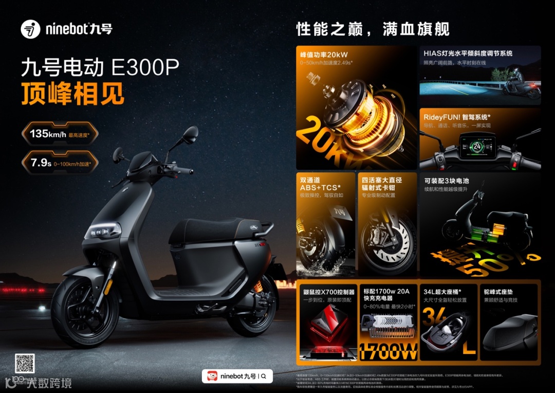其中E300P作为一款高性能城市踏板车,是九号E系列电摩顶配车型,实现了可搭载三块电池的新突破,0-50km加速仅需2.49秒,极速可达135km/h,三电池版本NEDC工况续航可达120km,双电池版本NEDC工况续航为85km,双电池版本零售价26499元起,首发期到手价24999元起。E300P搭载了装配最新RideyFun!的九号真智能系统,可在不摘手套、不掏手机、手不离车把手的前提下,操作导航、通话、播放音乐等功能。同时,E300P配备了ABS、TCS等骑行辅助系统以及HIAS系统(灯光水平倾斜度调节系统),保障用户骑行安全,这也是HIAS系统首次在国内应用到电动两轮车上,整体技术水平行业领先。
