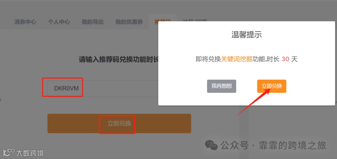 3. 输入所需功能的推荐码,点击【立即兑换】;