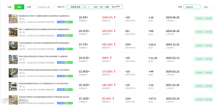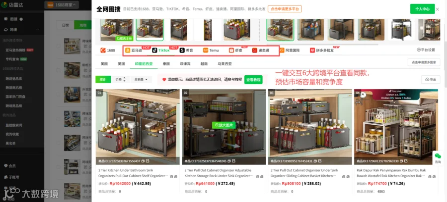 卖家可通过店雷达跨境选品工具来进行选品,用跨境商机榜来洞察近期有哪些热销品,以厨房收纳用品类目为例,可以看到橱柜分层储物、调料瓶收纳较为畅销,在使用全网图搜即可看到亚马逊、tk、虾皮、temu等平台上同款的市场容量和竞争度,辅助选品。