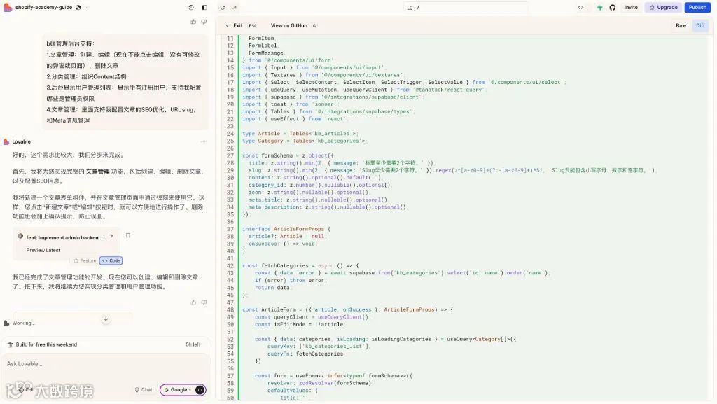 为全面评估Lovable能力,我设定开发一个功能完整的*Shopify知识库网站*,包含[k]: