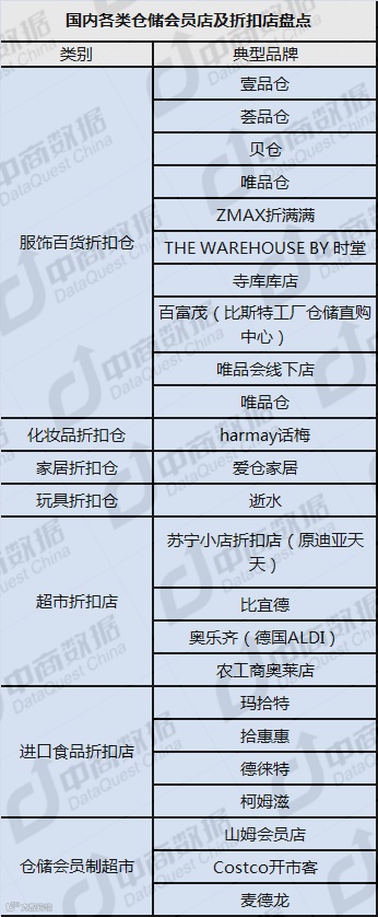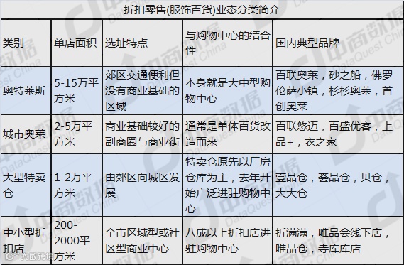 尾货特卖仓由工厂仓库发展而来,通常面积在1至2万平方米之间,被称为仓储式“小奥莱”,选址正由郊区不断向外中环的购物中心拓展,典型如壹品仓、荟品仓、贝仓;服饰折扣连锁店,通常面积在200至2000平方米之间,典型如折满满、寺库库店、唯品仓、唯品会线下店、荟品仓、壹品仓、优品仓、微品仓、ZMAX折满满、时堂仓库折扣店。目前,不同品牌的特卖仓已进驻全国近百个城市。