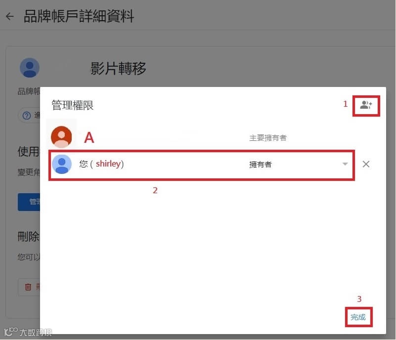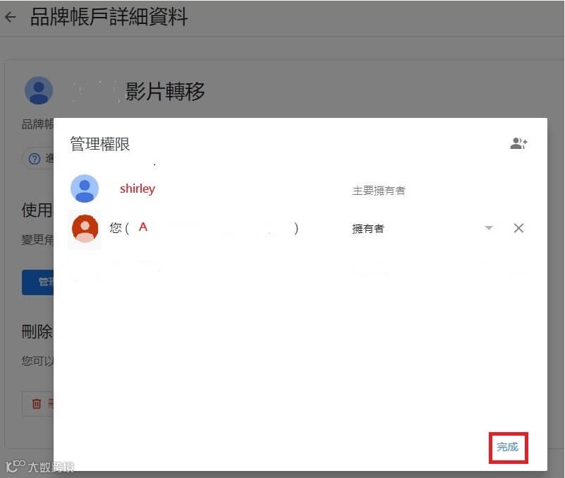 在品牌账户管理权限中添加新的Google账号(如Shirley)为“拥有者”,并保存设置。原账号A仍为当前主要拥有者,需等待至少7天后方可移交主导权[k]。
