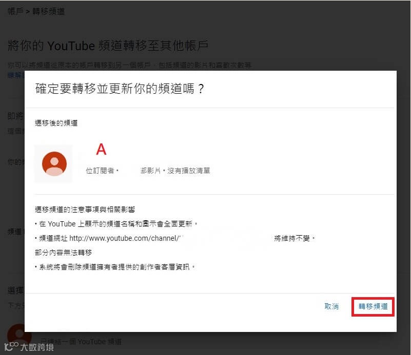弹窗提示“确定要转移并更新你的频道?”时,点击“转移频道”按钮即可完成品牌化转换。迁移后频道名称、URL及全部内容保持不变[k]。